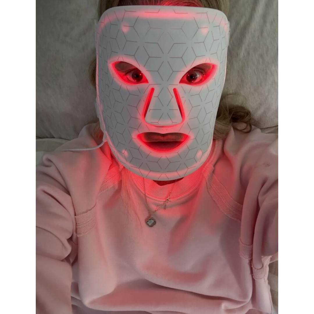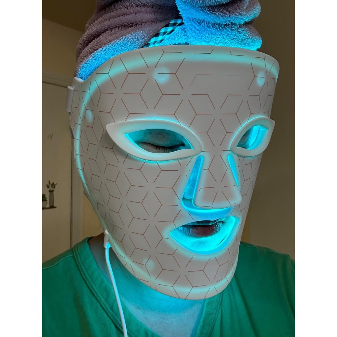 It uses red, blue, green, and yellow light therapy to stimulate collagen, reduce acne, fade dark spots, and calm sensitivity, promoting a smoother, brighter complexion.